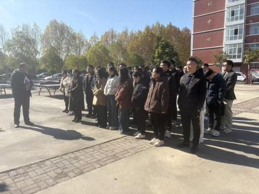 教师们神情专注、仪容严整,在光影交错中凝神聆听。现场氛围既严肃认真,又因阳光的浸润透出育人事业的温暖底色,展现出我校教师队伍严谨务实、清风正气的精神风貌。