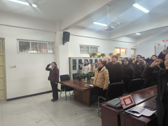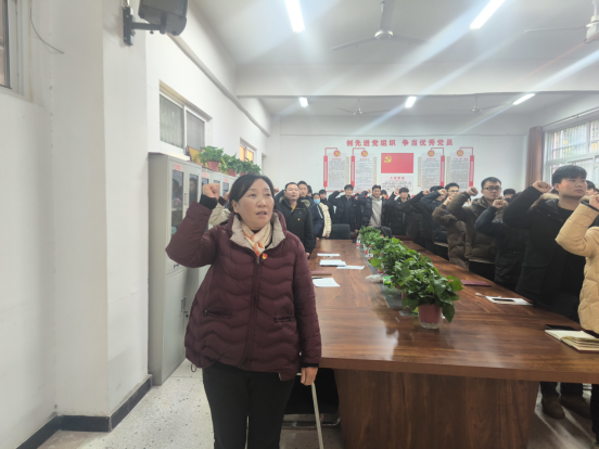 宣誓仪式在庄严的《国际歌》中拉开帷幕,与会人员全体起立、庄严合唱。胡亚威同志郑重宣读了新发展党员名单。随后,全体党员在崔海花书记的带领下整齐肃立,紧握右拳,面对鲜艳的党旗庄严宣誓。铮铮誓言,拳拳红心,铿锵有力的誓言表达了他们对党的深厚感情和为党的事业奋斗终生的坚强决心。