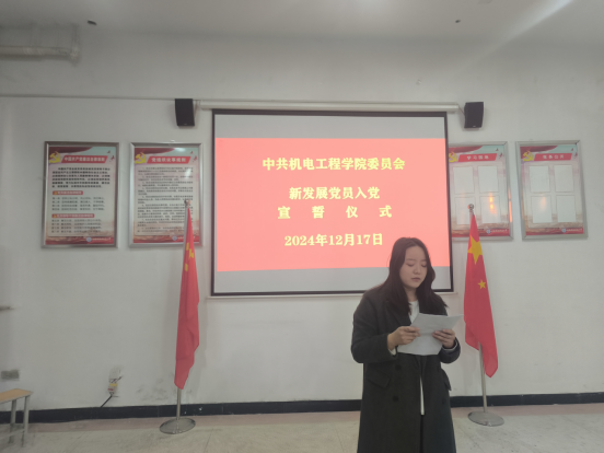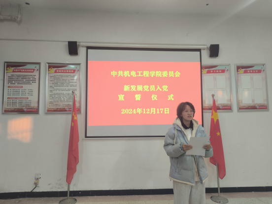 为进一步加强对新发展党员的党性教育,切实增强新党员的荣誉感、责任感、使命感,进一步强化新党员身份的认同感和党组织凝聚力,12月17日下午,我院在敏行楼212党员活动室举行了2024年下半年新发展党员入党宣誓仪式。学院党委书记崔海花、党委委员马莉冰、党委委员胡亚威、各党支部书记出席本次仪式,老党员代表、全体新发展党员参加仪式,仪式由专职组织员张文娟同志主持。