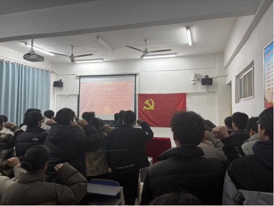 大会第三项议程,在张文娟、卓应广、张斌同志的带领下,本次转正同志及与会党员一起庄严肃立,高举右拳,面向党旗,进行入党宣誓。